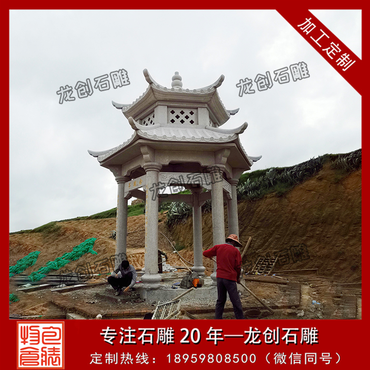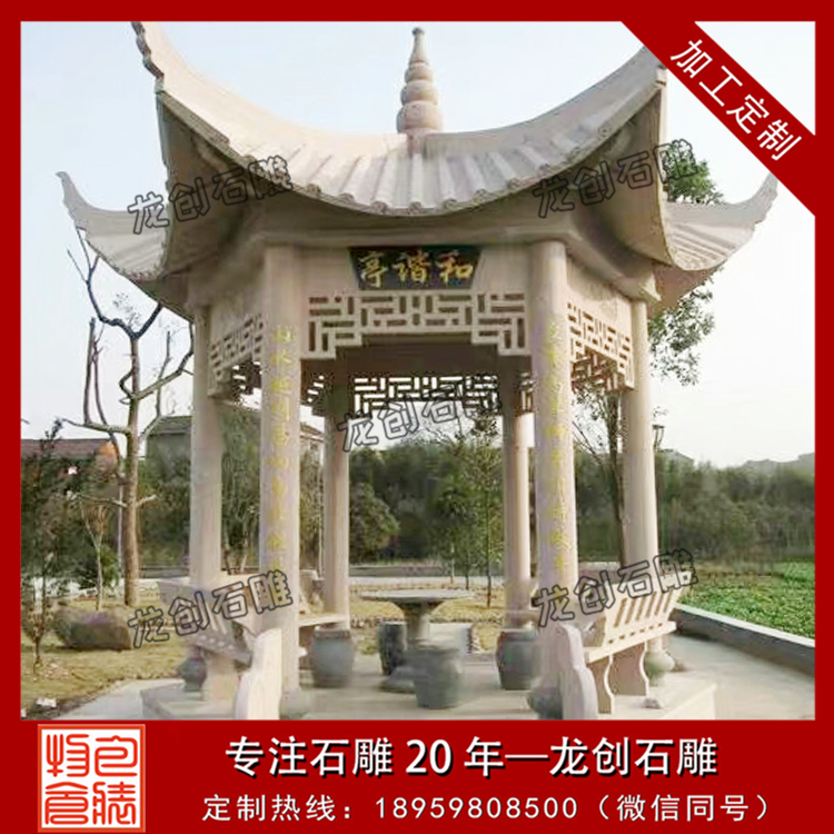 第三,必須通過各種雕刻手法,將石雕涼亭完美地展現出來。這一點是至關重要的。要完成一個石涼亭,有可能要用到圓雕、浮雕等多種手法,如果功夫不到家,是很難獨自完成一個精美的石涼亭的。