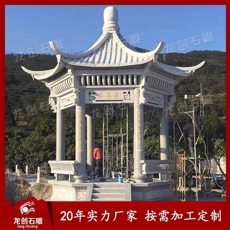 惠安涼亭石雕定制是指用石頭加工而成的亭子,多建于路旁,供行人休息、納涼或觀景用。石雕亭子一般為開敞性構造,沒有圍墻,頂部可分為六角、八角、圓形等多種形狀。其材質多選用青石、花崗巖、草白玉等。至于石雕亭子多少錢?就要看客戶要多少價位的亭子了,是3萬、5萬還是10幾萬等等,我們惠安龍創石雕都可以定制。