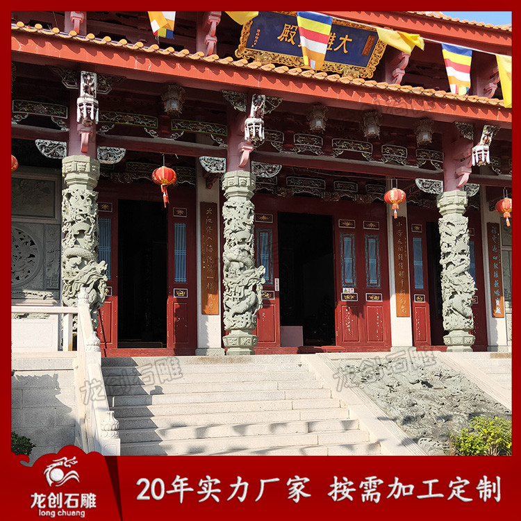 石雕龍柱在當今社會的應用非常廣泛,通常在寺廟、廣場、公園等都可以見到石雕龍柱,安裝在寺廟的龍柱較為常用石料的是青石龍柱,且工藝要求高。寺廟石雕龍柱由多種工藝制作,有圓雕,透雕,線雕,平雕,浮雕等工藝。石雕龍柱外形有圓形石雕龍柱和棱形石雕龍柱。泉州青石龍柱廠家,選匠心制作二十年,龍創石雕。